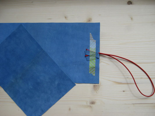 Ist die Länge ermittelt, wird auch das 2. Ende des Gummibandes festgenäht. Diese kleine Hilfskonstruktion wird nun an das untere Ende der Tasche mittig platziert.