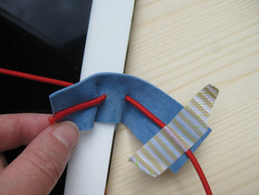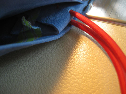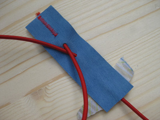 Für das unsichtbare Festnähen des relativ dicken Gummibandes (2mm) benötige ich eine Hilfskontruktion, die später im Inneren der Hülle verschwindet.