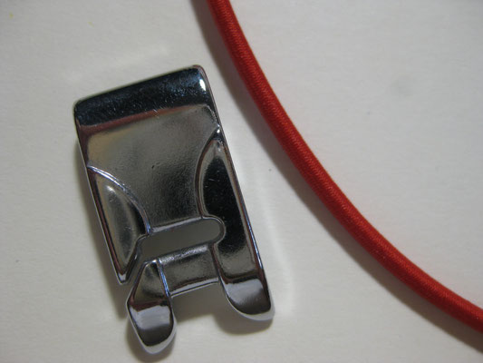 Für das Nähen des Gummibandes habe ich einen Fuß ausgewählt, der auf der Rückseite eine Aussparung hat. So läßt es sich einfacher nähen.