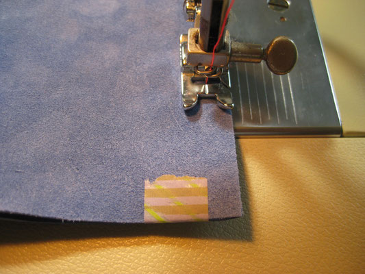 Auch Stecknadeln machen Löcher in Leder. Dehalb habe ich Washi-Tape benutzt, das man mittlerweile sogar im Drugstore kaufen kann. Es läßt sich reißen, ist dünn und hinterläßt keine Spuren. Ich finde das praktisch und nutze es auch gerne für Markierungen an meiner Nähmaschine. Das Washi-Tape wird jeweils kurz vorher entfernt. Es dient nur der kurzfristigen Fixierung.