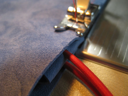 Aus diesem Grund habe ich auch die kleine Hilfskonstruktion für das Gummiband gewählt- Hätte ich einfach häufig vor- und zurück genäht wäre das Leder ruiniert gewesen. (Bei flachen Gummibändern ist das natürlich anders, da hätte ich einfach drüber nähen können.)